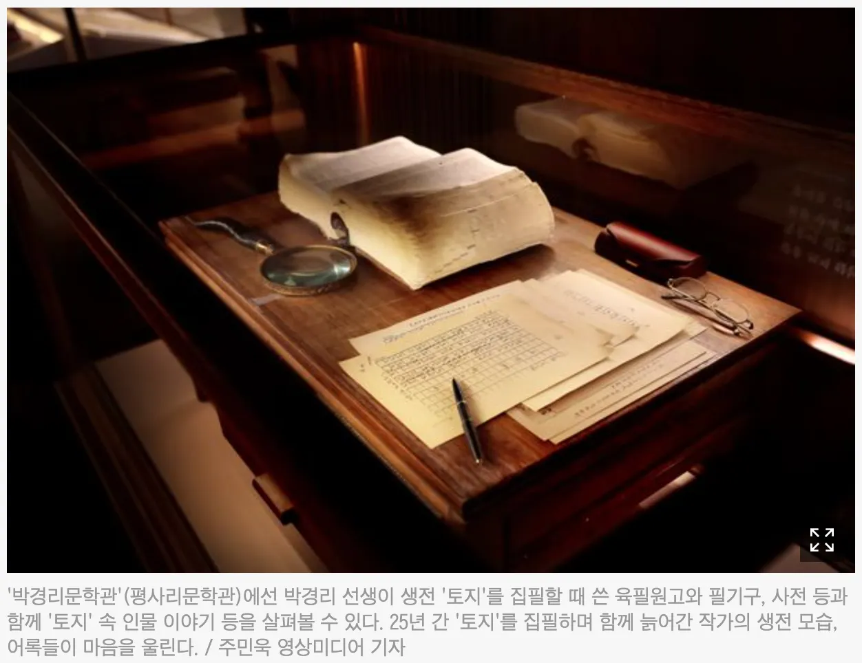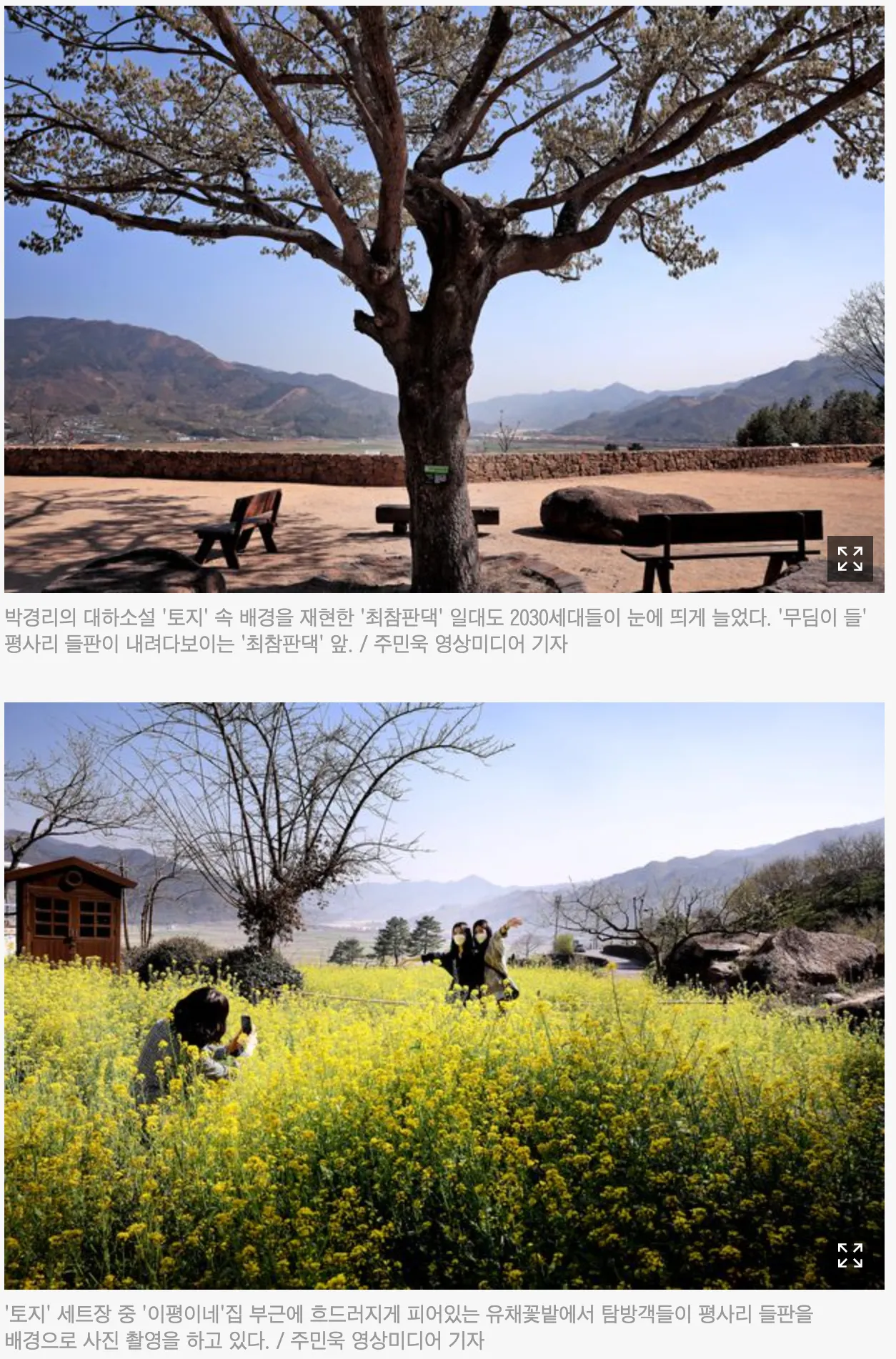 최참판댁 누마루에서 바라보는 전망을 최고로 치지만 ‘토지’ 세트장 내 ‘관수네’ 툇마루 네모난 문틀 너머 바라보는 평사리 전망도 아름답다. ‘이평이네’ 집 뒤편으로는 유채가 한창이다. 벌이 윙윙 날아다니는 와중에도 유채와 평사리 들판을 배경으로 기념사진 찍겠다는 이들이 줄을 선다. 들판 한복판의 부부송은 여전한 금실을 뽐내며 평사리를 지키고 있다. 최참판댁 탐방 전 박경리문학관에 들러 소설 ‘토지’의 탄생 배경이나 박경리 선생이 직접 쓴 육필 원고부터 만나면 감동이 배가된다.