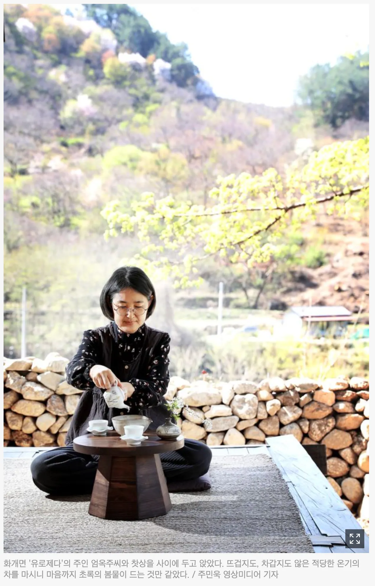 화개면 정금리 유로제다의 주인 엄옥주(57)씨가 깔개 위에 찻주전자와 찻잔, 거름망이 가지런히 놓인 다실에서 차를 내려주며 말했다. 소반 위엔 시음할 차 3종이 적힌 메뉴 안내서와 차에 곁들일 다식(茶食), 차나무 씨앗이 담긴 기념 선물이 놓여 있었다. 엄씨는 “예전엔 차에 관심이 많은 4050 중년층이 다도 체험을 위해 많이 찾아왔지만, 코로나 사태 후 최근 1~2년 사이 20~30대 젊은 층이 주로 찾고 있다”고 했다. 이어 “감각 있는 젊은 층 취향을 고려하다 보니 차뿐 아니라 곁들여 내는 다식, 찻상차림에 대한 고민이 깊다”며 웃었다. 다식은 옆 동네 악양에서 나는 곶감에 크림치즈와 견과류로 모양을 냈다. 차나무의 고운 향이 느껴지는 녹차부터 여린 찻잎을 발효시켜 낸 홍차, 하동에서 난 쑥과 상황버섯 등을 섞어 발효시킨 ‘삼합차’까지 코스처럼 나온 차와 제법 잘 어울리는 맛이다. 창문 너머 펼쳐지는 마을 뒷산과 방문만 열면 만날 수 있는 차밭 풍경은 덤. 차를 마시는 동안 개울 소리는 배경 음악이 되어 준다.