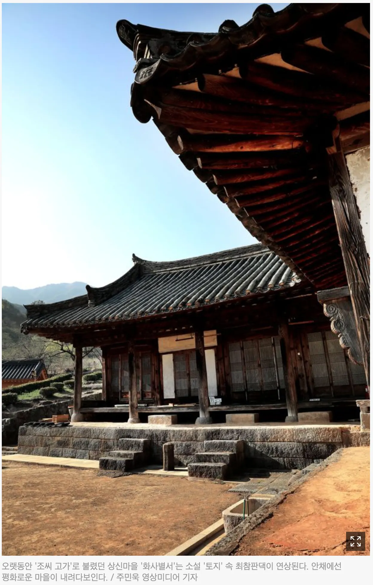 가 나온다. 오랫동안 ‘조씨 고가’ ‘조부자 집’으로 불렸던 곳이다. 조선의 개국 공신이자 태조 때부터 태종 때까지 영의정을 지낸 조준의 직계 손인 화사 조재희가 재건한 별서라 2018년 화사별서로 명칭을 변경했다. 국풍(나라의 풍수를 보는 이)을 대동해 자리 잡았다 전해지는 별서는 1890년대 초반에 조성됐으나 동학농민운동 때 화재로 소실됐다가 1900년대 들어서면서 재건했다. 다시 6·25전쟁을 거치며 사랑채, 대문채, 초당 등 일부 건축물이 불타 소실되고 현재 안채, 행랑채 등이 원형을 보존하고 있다. “화사별서는 최참판댁의 모델이 된 곳”이라는 게 이곳 건축주의 4대손인 조덕상 경북대 교수의 말. 조 교수의 아버지 조한승(97) 옹이 실제 거주하는 공간으로 코로나로 인해 금~일요일에 한해서만 대문을 열어놓는다.