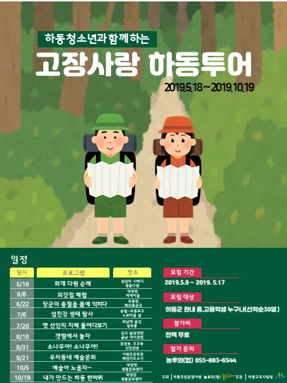 학교와 마을이 만나 배움과 나눔이 넘치는 행복한 하동! 주제로 20명의 관내 중,고등학생들과 함께 총 10회동안 하동 구석구석을 다녔습니다!