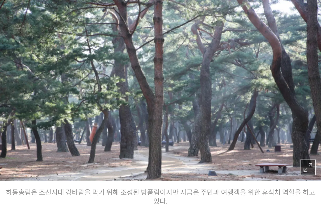 하동에는 유독 소나무가 많다. 평사리에서 섬진강을 따라 이어지는 19번 국도 반대편에는 천연기념물 하동송림이 자리하고 있다. 하동송림은 조선 1745년(영조 21년) 당시 도호부사 전천상이 강바람과 모래바람을 막기 위해 조성한 소나무 숲이다. 750여 그루의 노송이 우거진 숲 주변으로는 섬진강을 감상하며 숲 주변을 한 바퀴 돌 수 있는 멍석 길이 깔려 있다. 바깥에서 바라보는 것보다 안에서 밖을 내다보는 풍경이 더 아름답다.