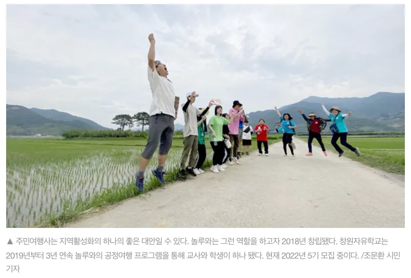 ◇지역을 보듬는 대안여행 = 주민공정여행사를 운영하는 사람으로서 나는 2019년부터 감지했던 것이 있었다. 기존 대중여행의 종말이다. 이것이 코로나19로 확연하게 끝마무리를 했지 싶다. 감히 말할 수 있는 것은 주민공정여행사를 운영하면서 '촉'이라는 것이 생겨났다. 다양한 여행자를 만나고 흐름을 읽은 결과이지 싶다. 주민여행사를 운영하는 사람들을 나는 한국 로컬여행의 소총수에 비유한다. 첨단무기를 소지할 수 없는 영세한 군인들이다. 단지 철모에 소총이 전부인 이들이다.