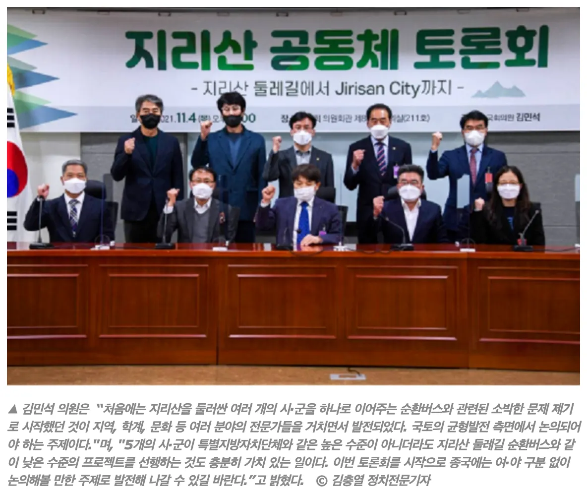 김민석 의원(서울 영등포구을 선거구, 국회 보건복지위원장)은 지난 11월 4일(목)오후 2시 국회에서 지방소멸위기 대응을 위한 지리산 공동체 토론회 ‘지리산 둘레길에서 지리산 시티까지’를 개최했다.