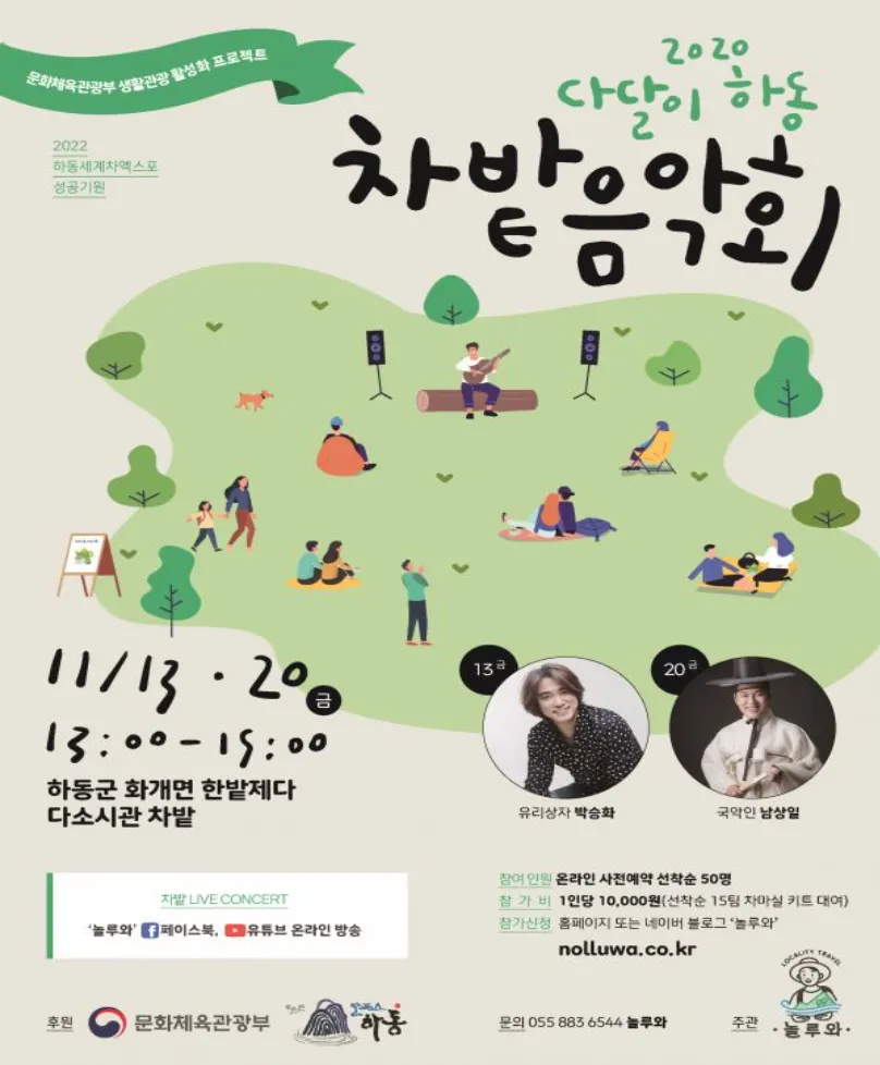 코로나19 속에 치러지는 만큼 사전예약 50명 한정으로 차밭음악회가 진행되며 여유롭게 하동을, 차를 즐길 수 있도록 차마실 자리가 펼쳐질 예정이다.