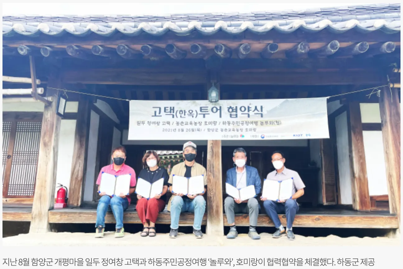 또 지난 8월 놀루와 측은 함양 개평마을에 사무실을 둔 ‘호미랑’(대표 도을주)과 ‘꽃담’(대표 이정숙)과도 협약을 맺고 양 지역 고택과 문화콘텐츠를 기반으로 한 여행상품을 개발했다.